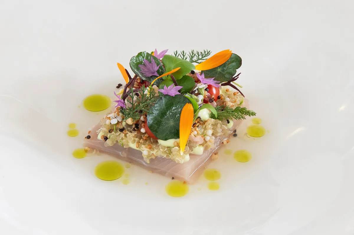 gepocheerde tarbot – farce van Oost-Indische kers – bulgursalade