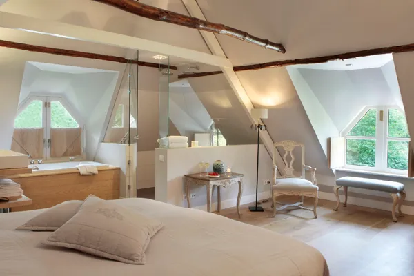 De Grand Suite in het Manegehuis biedt met de ligging aan de rand van het landgoed veel privacy tijdens het verblijf. De suite bestaat uit twee verdiepingen. Op de begane grond biedt het een grote zithoek met open haard, een riante eettafel en toegang tot uw privéterras met omheinde tuin. Op de eerste etage is het slaapvertrek gelegen met luxe open badkamer en sauna.