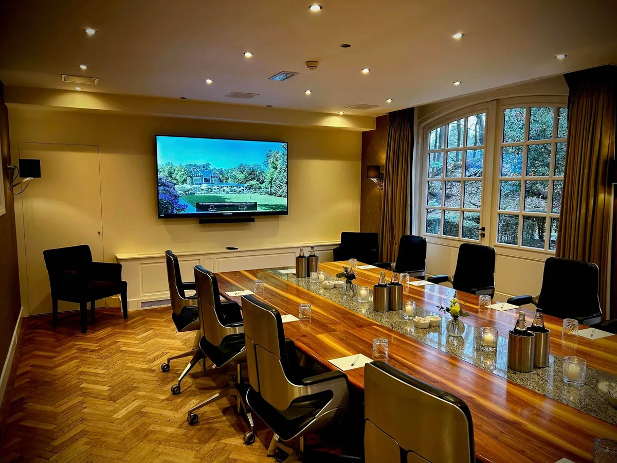 Met een oppervlakte van 120 vierkante meter is de Prentenzaal onze grootste vergaderruimte. In 2023 is deze vergaderruimte geheel gerenoveerd en uitgerust met geluidsabsorberende technieken in de wanden en het plafond voor optimale akoestiek. Dankzij de grote raampartij heeft u prachtig uitzicht op de tuin en via een privé in- en uitgang bereikt u zo ons Poolhouse voor een kleine pauze of maakt u een korte wandeling door de tuinen op het landgoed. Afhankelijk van uw gewenste vergaderopstelling is de Prentenzaal geschikt voor een gezelschap van maximaal 50 personen (in theateropstelling) of 30 personen (in carré).